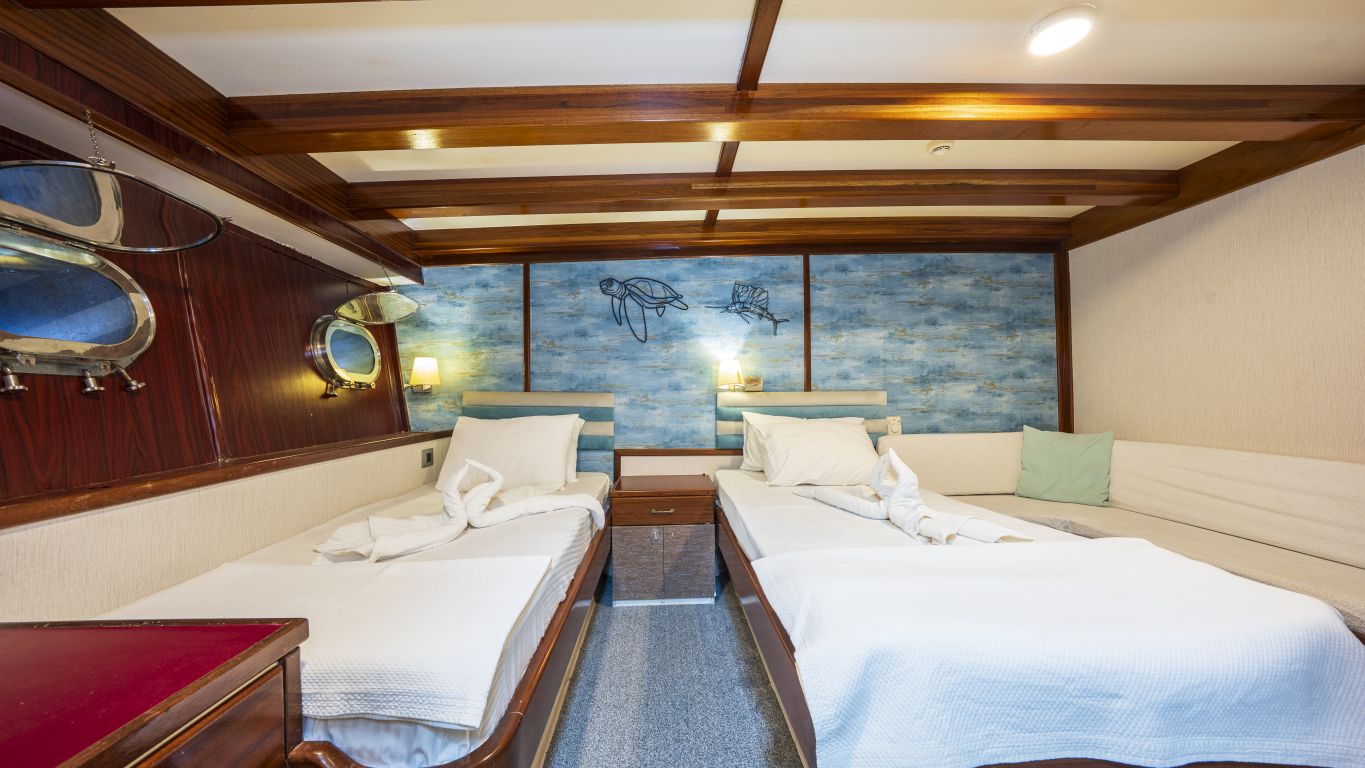 | Jusqu'à 24 invités; 6 Cabines Doubles, 6 Cabines Twin, Salon et toutes les cabines climatisés, TV dans toutes les cabines, cabine de douche et toilettes type maison dans toutes les cabines, Cabines équipage séparées |