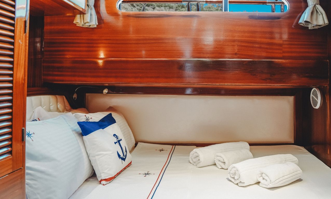 | Jusqu'à 8 personnes; 1 cabine principale, 2 cabines doubles, cabine de douche et toilettes dans toutes les cabines, cabines d'équipage séparées. |