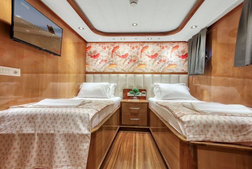 | Jusqu'à 10 personnes; 1 cabine principale, 2 cabines doubles, 1 cabine twin, cabine de douche et toilettes dans toutes les cabines, cabines d'équipage séparées. |