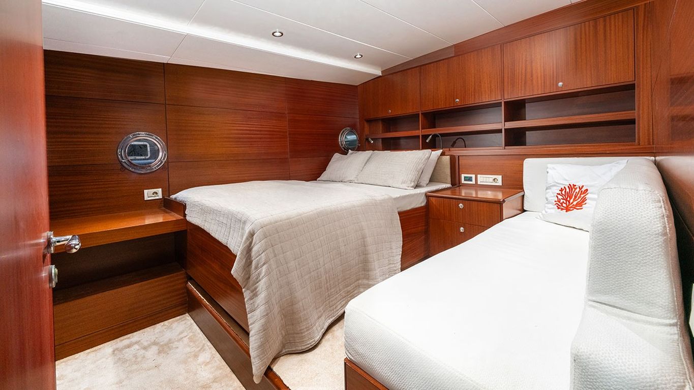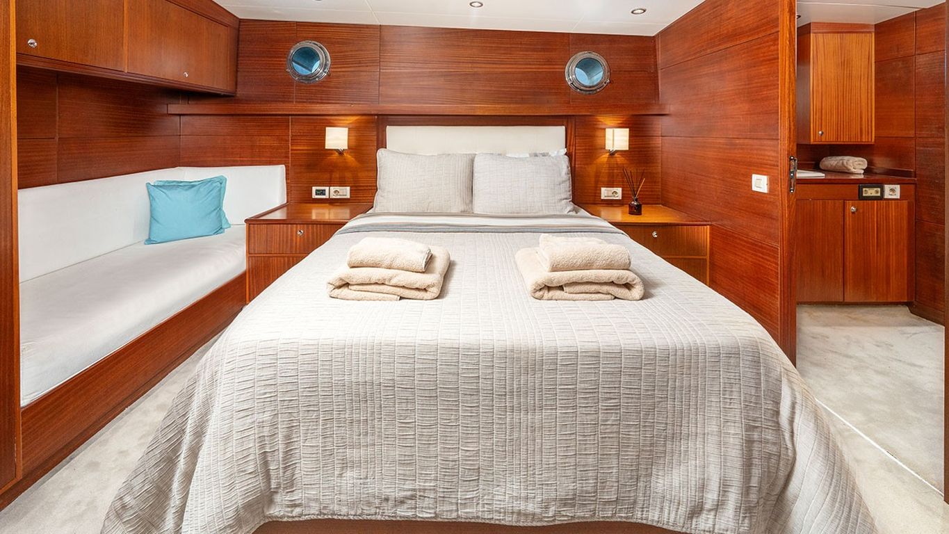 | Jusqu'à 10 personnes ; 2 VIP, 1 Master, 2 cabines doubles, cabine de douche et toilettes dans toutes les cabines, cabines d'équipage séparées. |