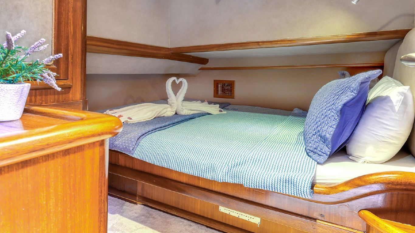 | Jusqu'à 10 personnes ; 2 cabines principales, 3 cabines doubles, cabine de douche et toilettes dans toutes les cabines, cabines d'équipage séparées. |
