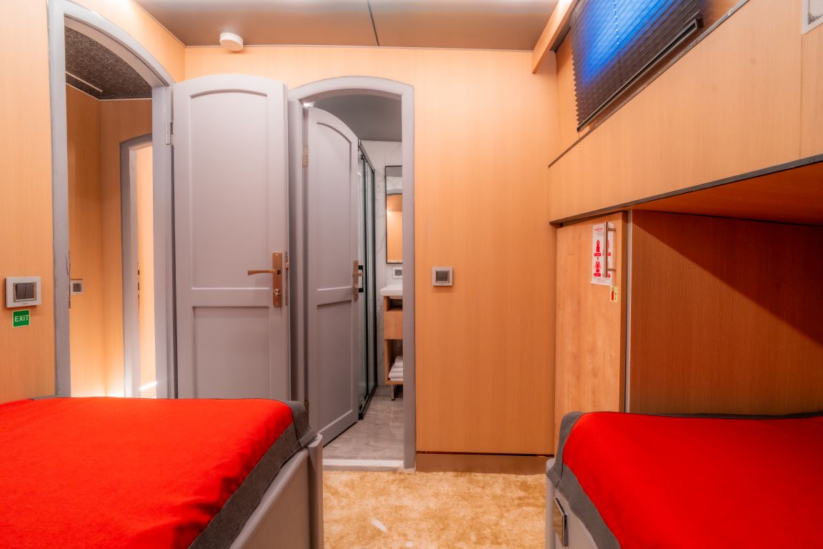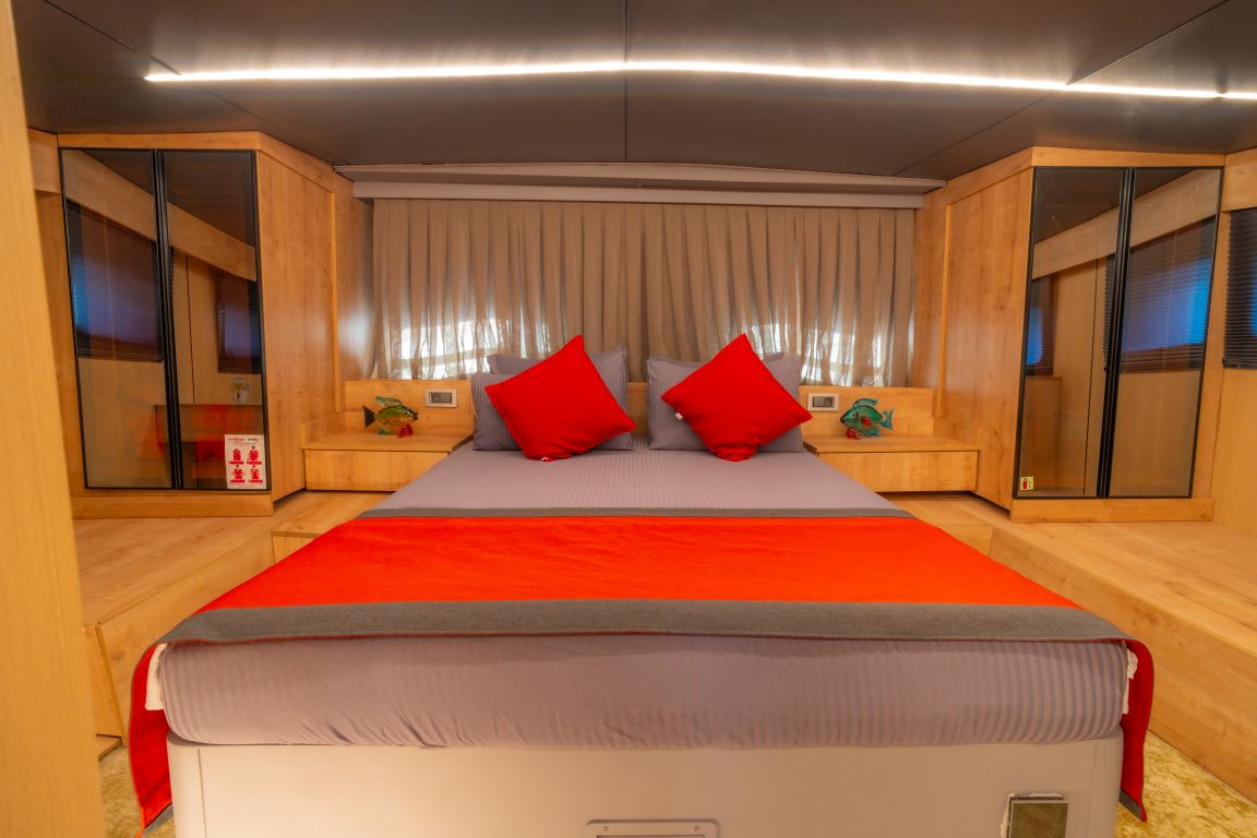 | Jusqu'à 10 personnes; 2 cabines Master, 1 cabine double, 2 cabines à lits jumeaux (convertibles en lit double). Climatisation, douche et toilettes de type domestique dans toutes les cabines. Cabines équipage séparées. |