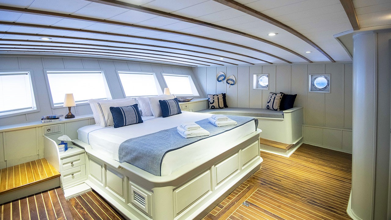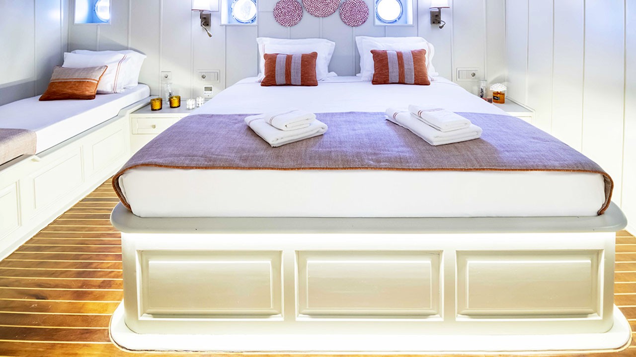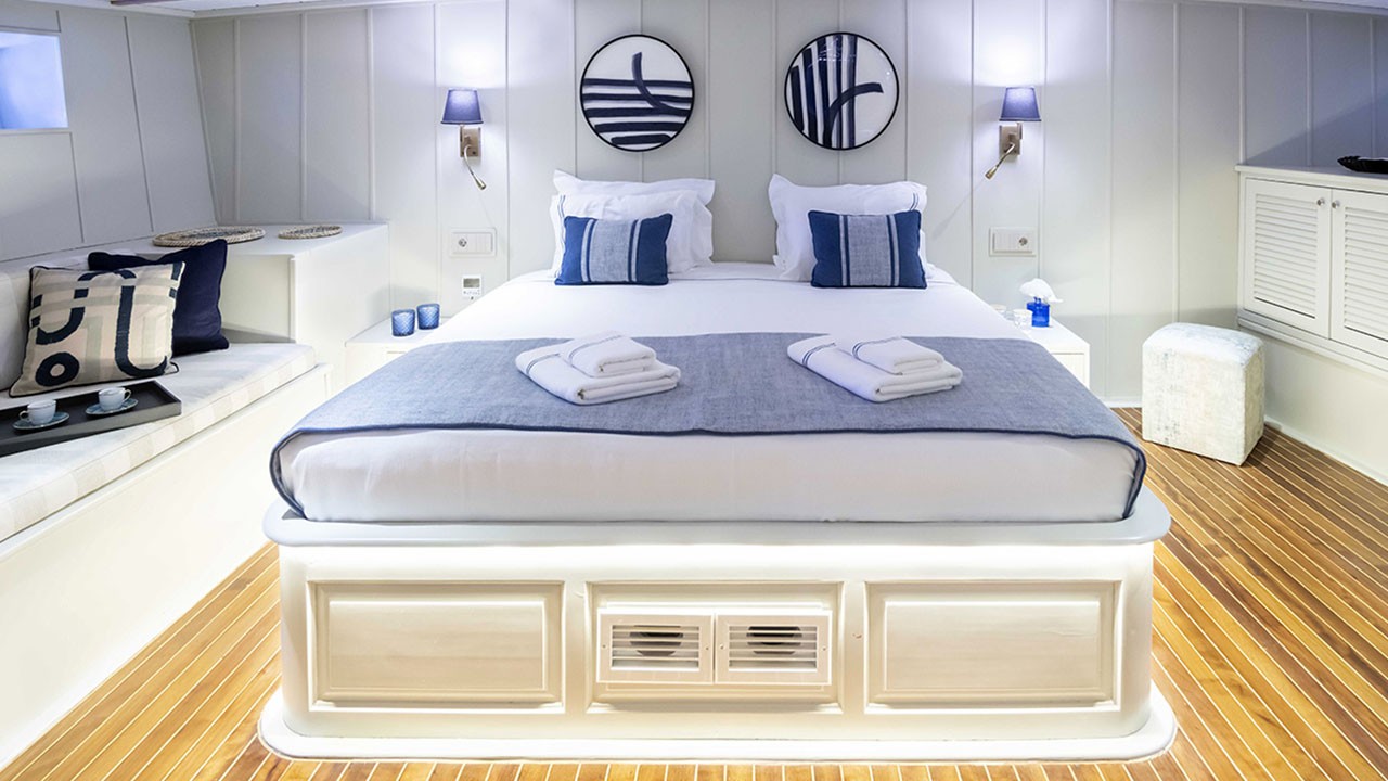 | Jusqu'à 12 personnes ; 2 cabines principales, 1 double, 2 cabines triples, cabine de douche et toilettes dans toutes les cabines, cabines d'équipage séparées. |