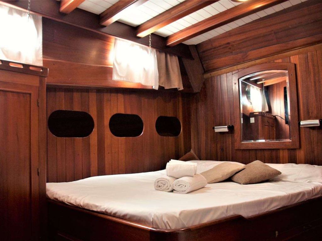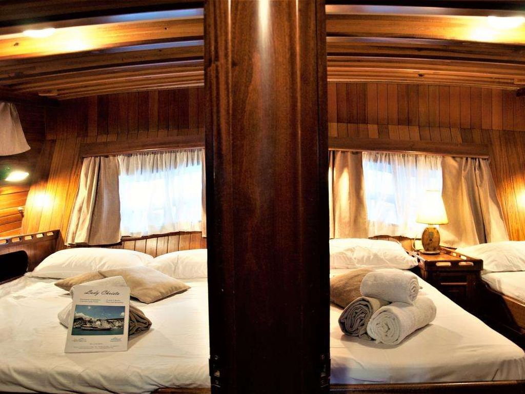 Jusqu'à 12 personnes ; 1 cabine principale, 2 cabines doubles, 2 cabines twin, cabine de douche et toilettes dans toutes les cabines, cabines d'équipage séparées.