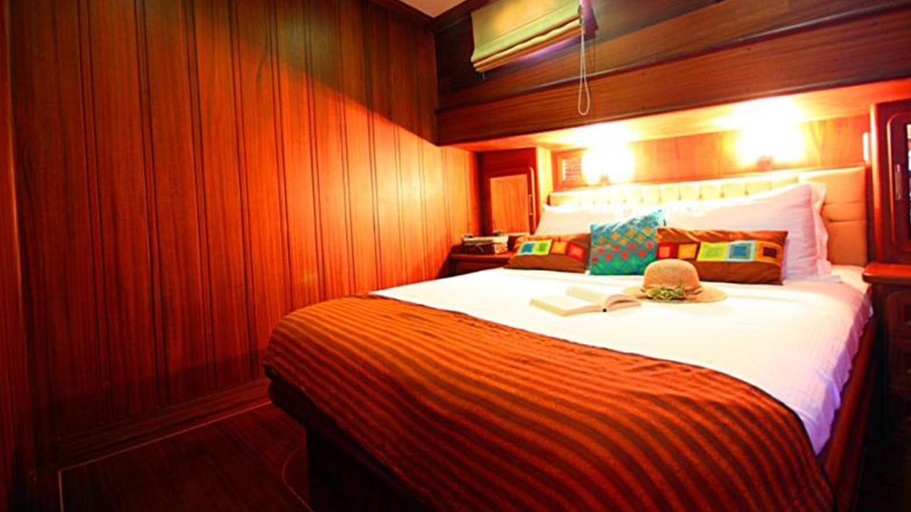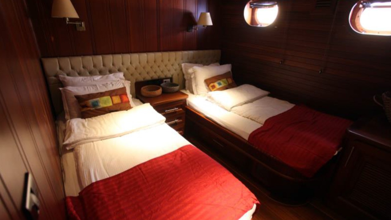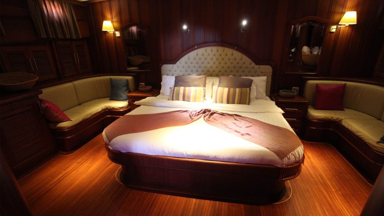 | 6 cabines comprenant : 2 cabines principales avec lit double queen-size, 2 cabines doubles et 2 cabines avec lits jumeaux. Capacité maximale : 12 personnes. Toutes les cabines disposent d'une salle de bain privative avec douche à jets puissants, d'une climatisation individuelle à télécommande et de toilettes à chasse d'eau. Cabines d'équipage séparées. |