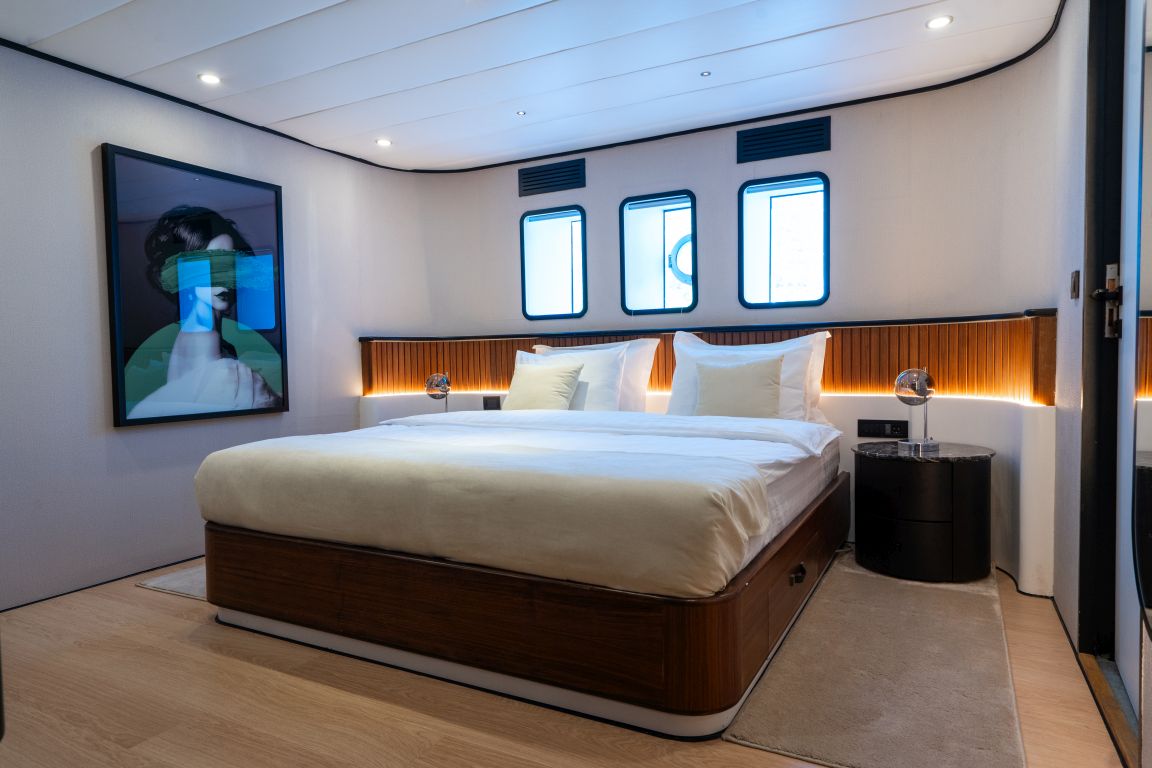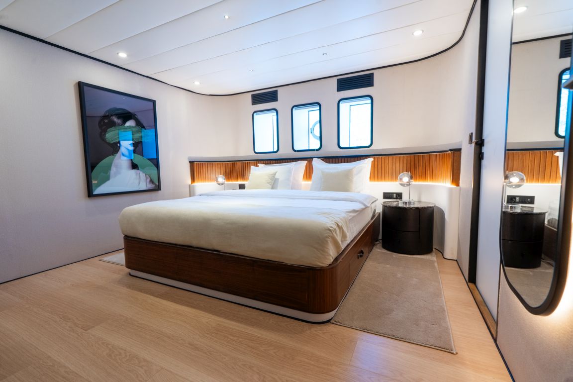 | Jusqu'à 14 personnes ; 1 cabine principale, 6 cabines doubles, cabine de douche et toilettes dans toutes les cabines, cabines d'équipage séparées. |