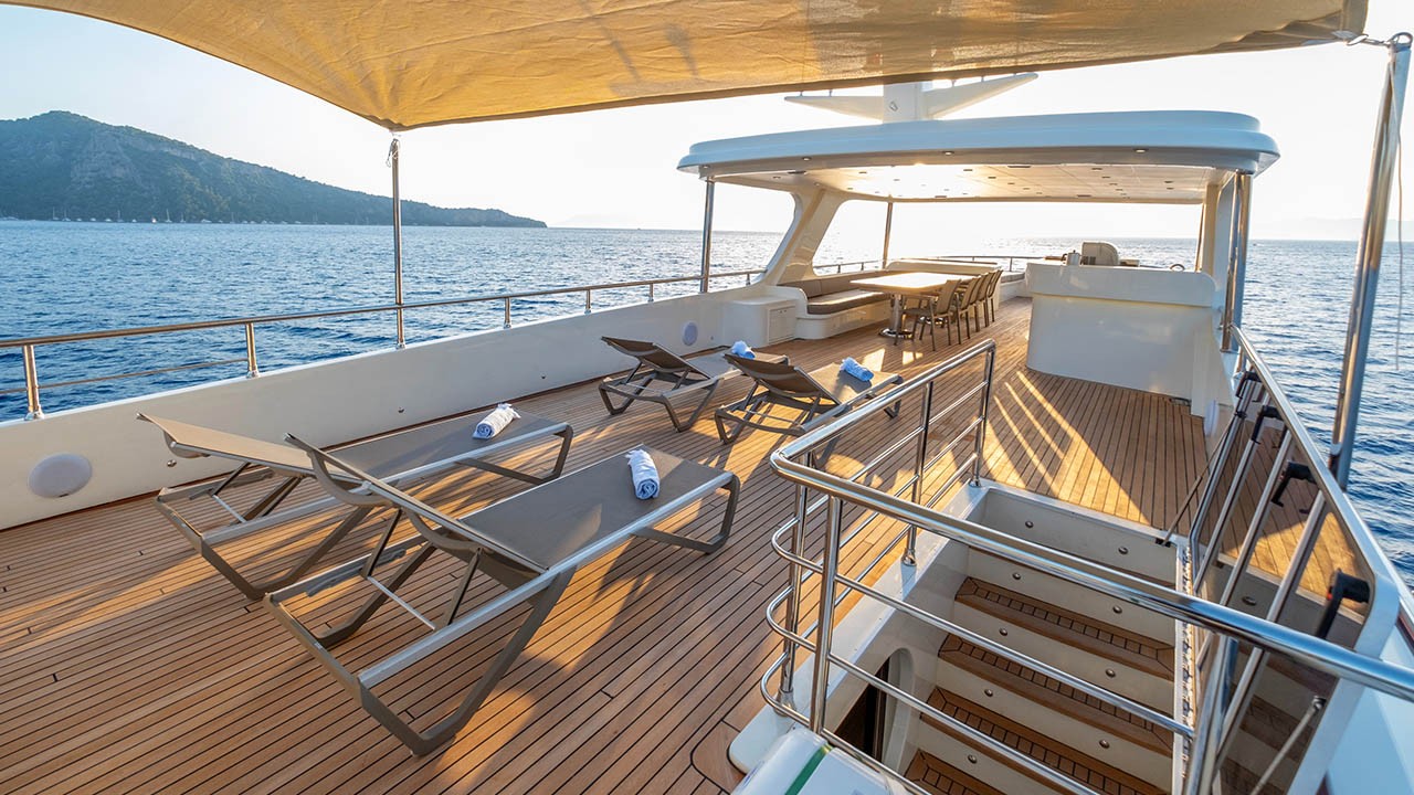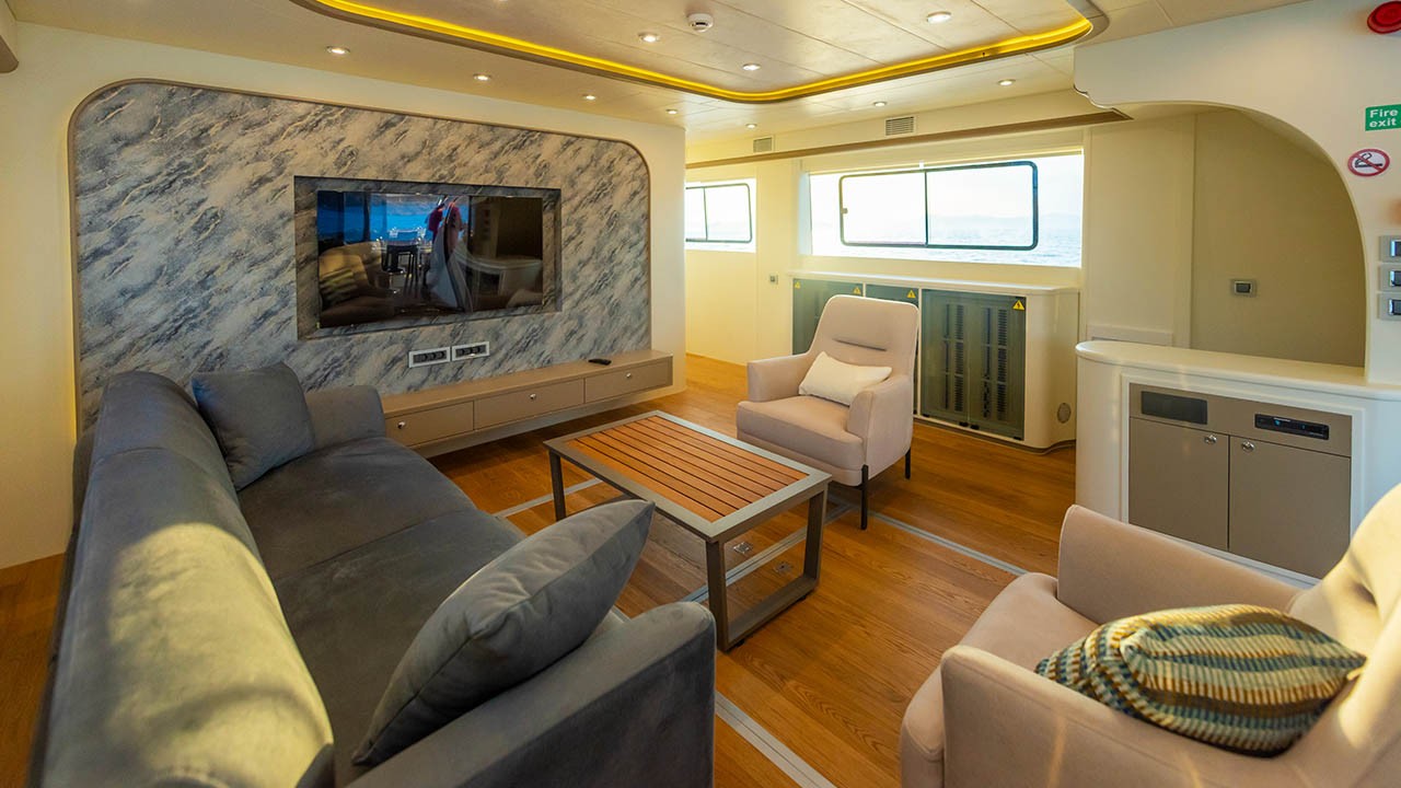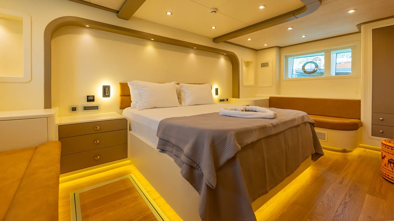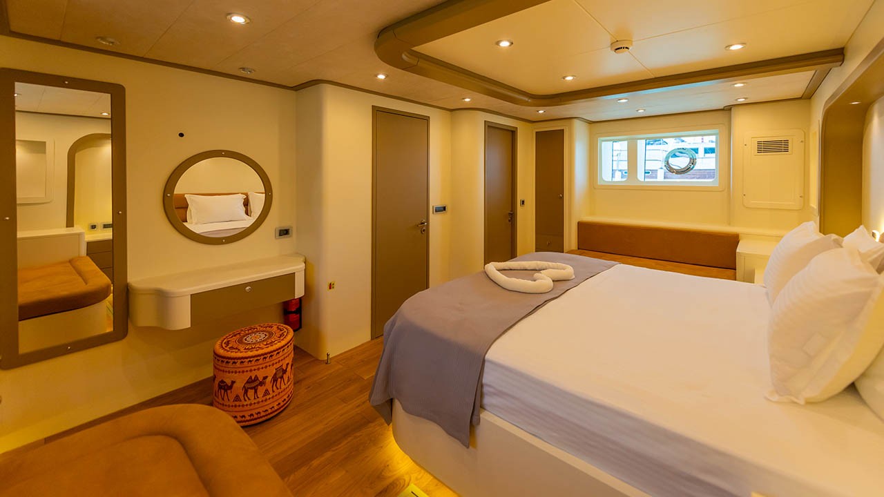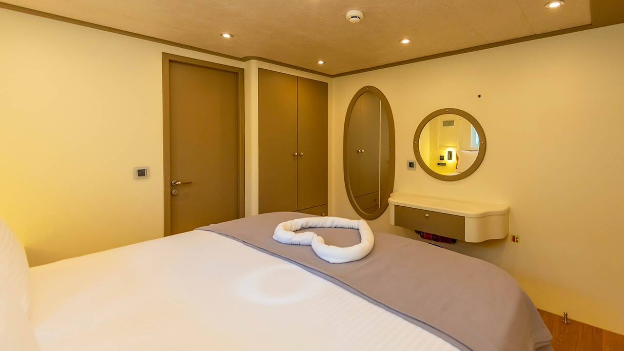 6 cabines comprenant : 2 cabines principales avec lit double, 4 cabines doubles. Toutes les cabines sont équipées d’une salle de bain privative, de la climatisation individuelle à télécommande, de la télévision par satellite, d’un système audio, de toilettes à chasse d’eau, d’un sèche-cheveux et d’extincteurs. |