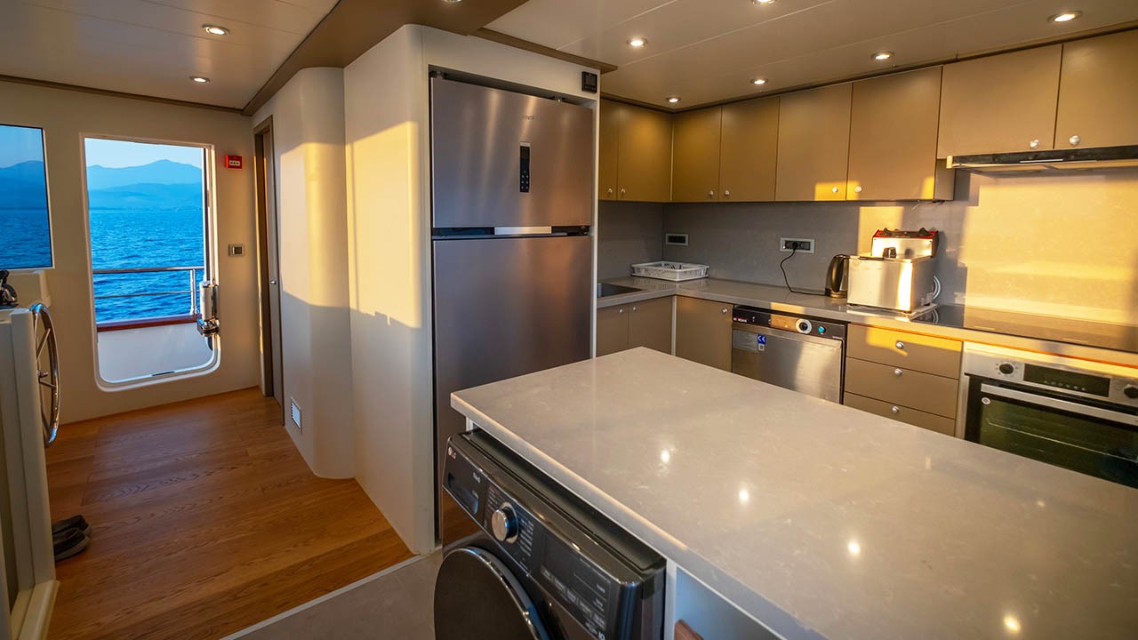 Équipement de navigation complet : radar, GPS, sondeur, Navtex, pilote automatique, VHF, téléphone GSM, dessalinisateur. Loisirs : ski nautique, planche à voile, canoë, bouée tractée, wakeboard, paddle, matériel de plongée avec tuba et de pêche, TV LCD, Wi-Fi. |