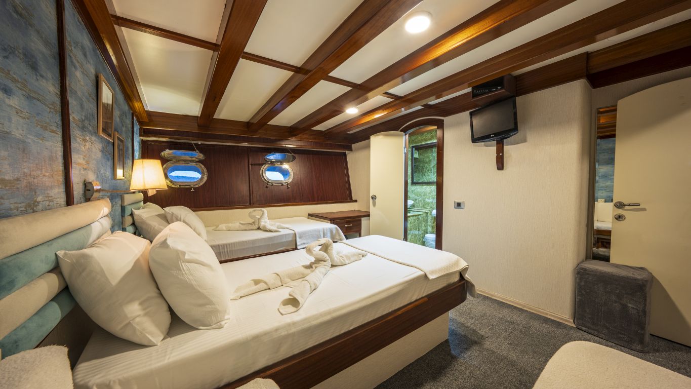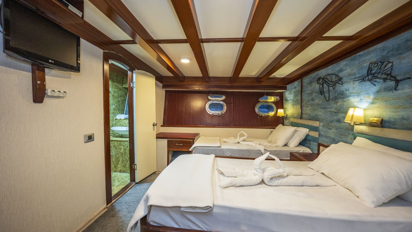 | Jusqu'à 24 invités; 6 Cabines Doubles, 6 Cabines Twin, Salon et toutes les cabines climatisés, TV dans toutes les cabines, cabine de douche et toilettes type maison dans toutes les cabines, Cabines équipage séparées |