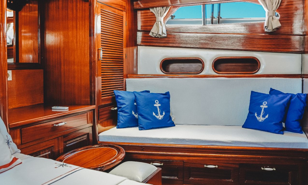 | Jusqu'à 8 personnes; 1 cabine principale, 2 cabines doubles, cabine de douche et toilettes dans toutes les cabines, cabines d'équipage séparées. |