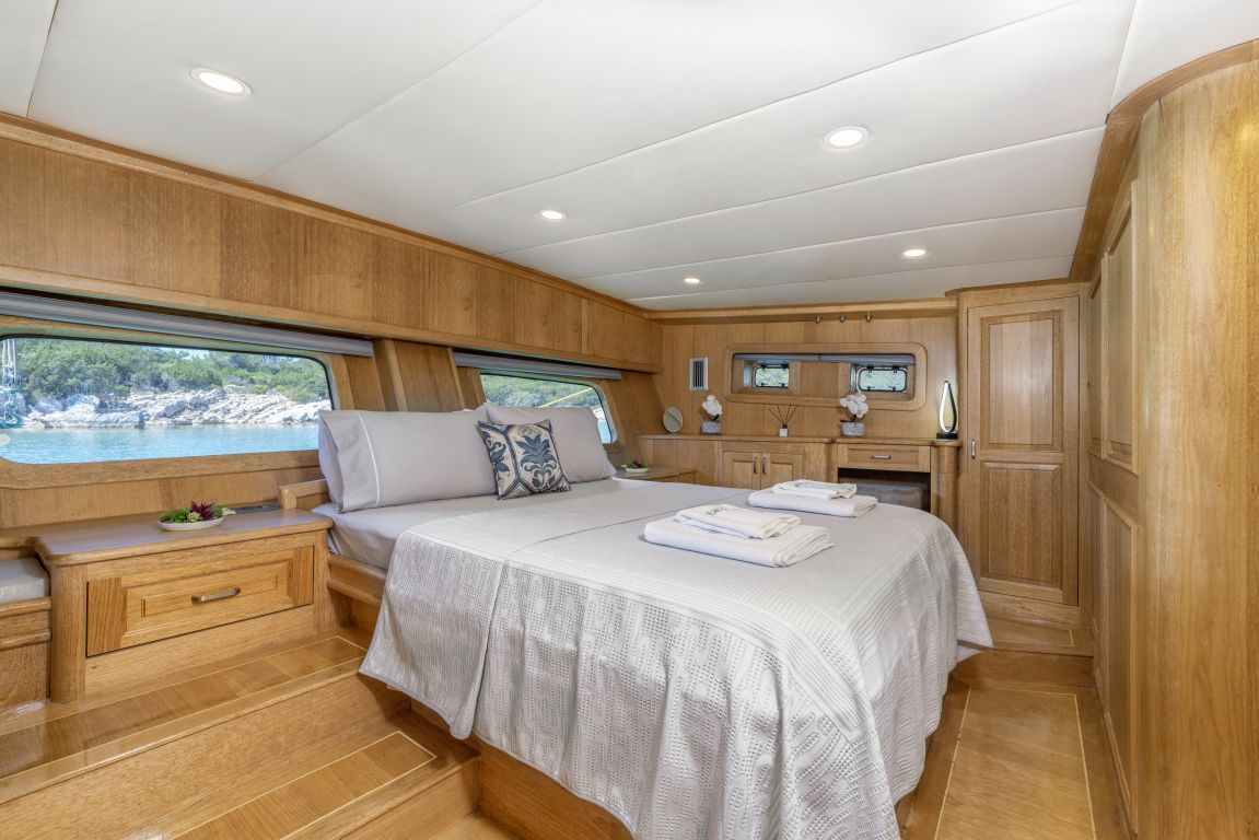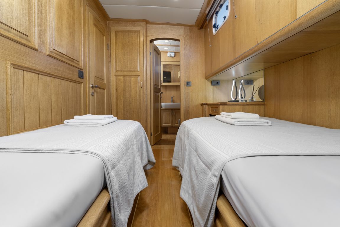 | Jusqu'à 8 personnes ; 2 cabines principales, 1 double, 1 cabine twin, cabine de douche et toilettes dans toutes les cabines, cabines d'équipage séparées. |
