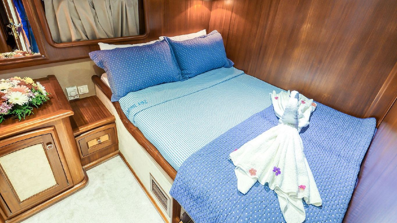| Jusqu'à 10 personnes ; 2 cabines principales, 3 cabines doubles, cabine de douche et toilettes dans toutes les cabines, cabines d'équipage séparées. |