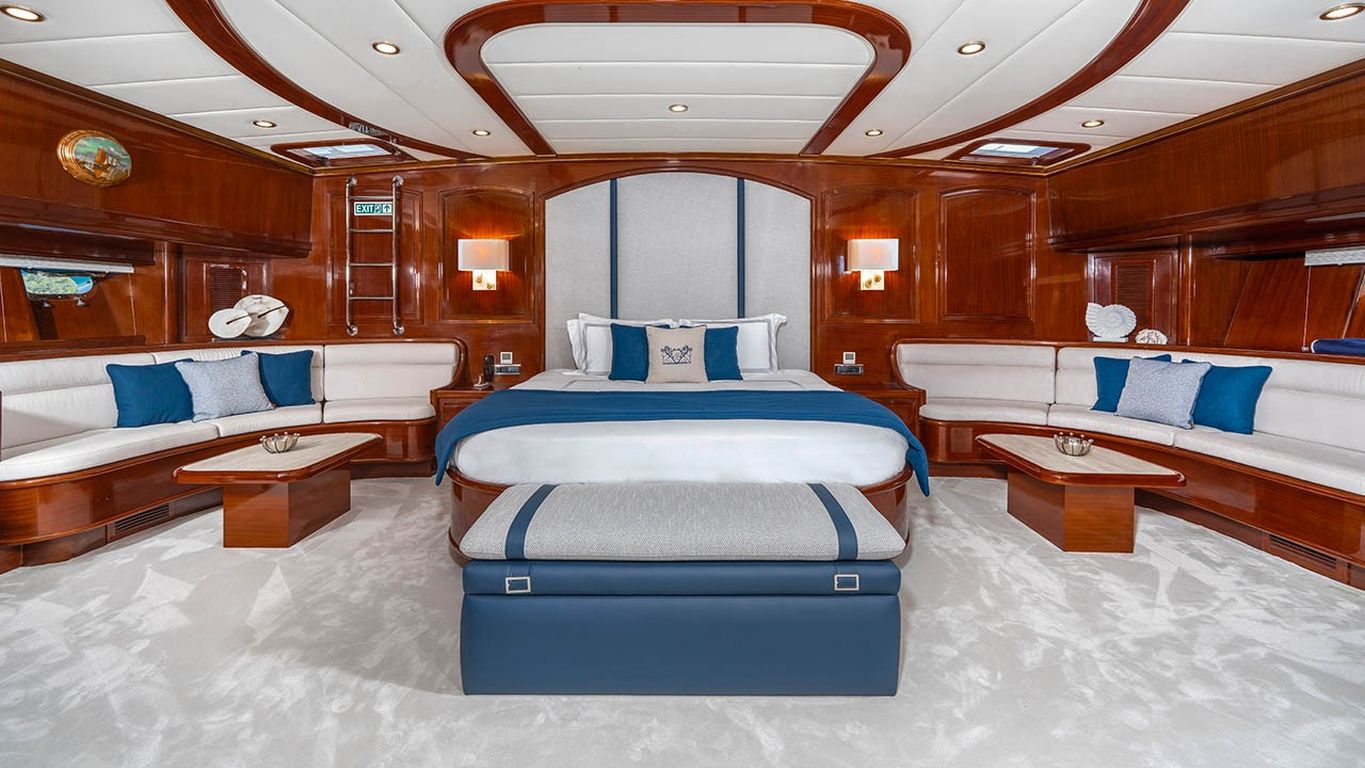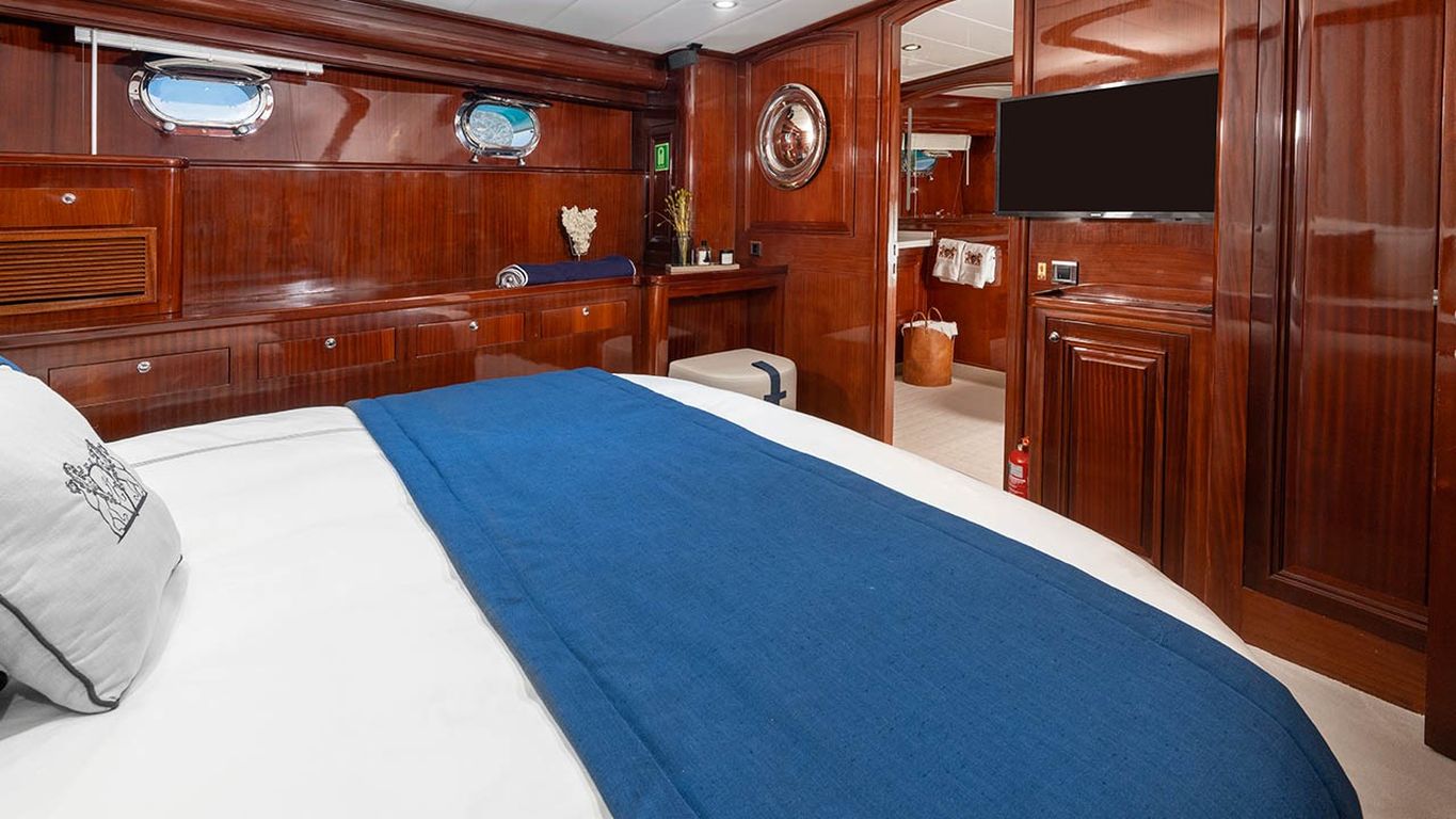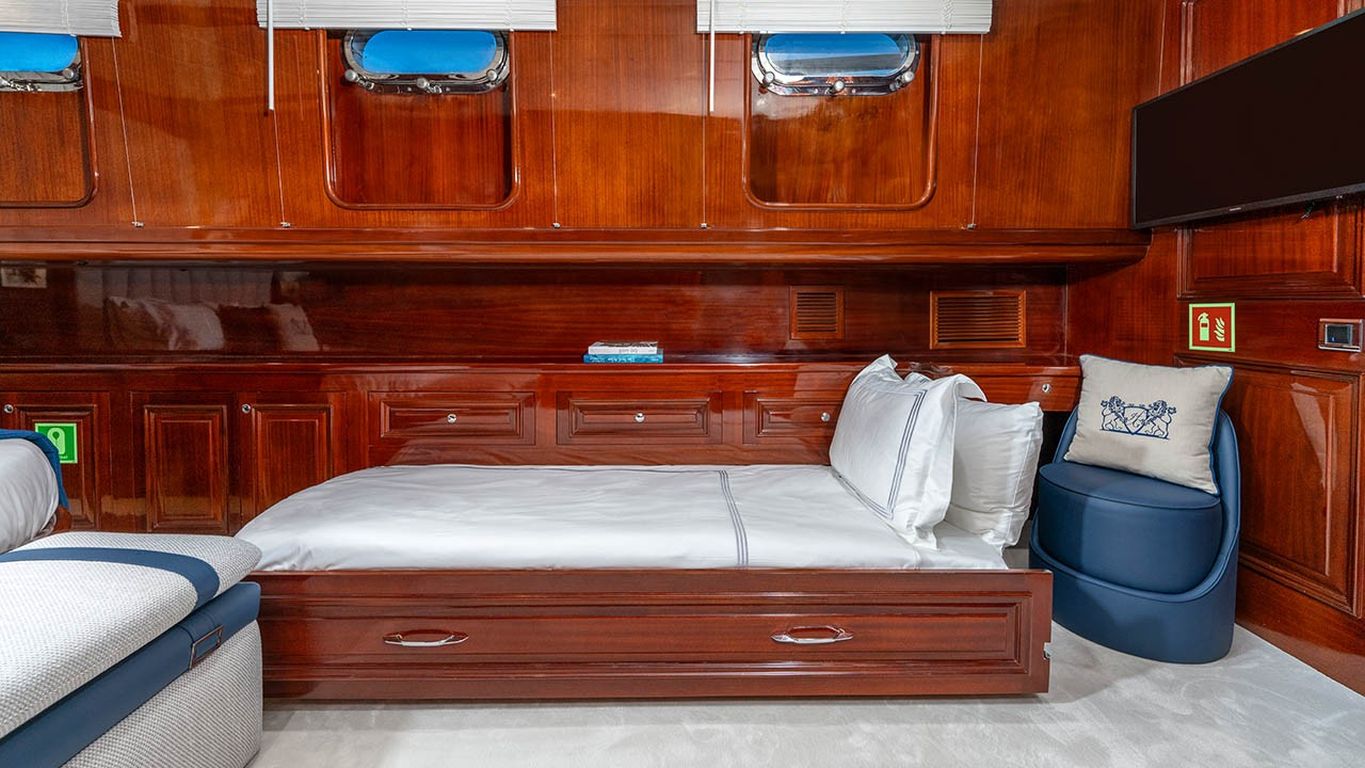 | Jusqu'à 12 personnes ; 2 cabines principales, 3 cabines doubles, cabine de douche et toilettes dans toutes les cabines, cabines d'équipage séparées. |