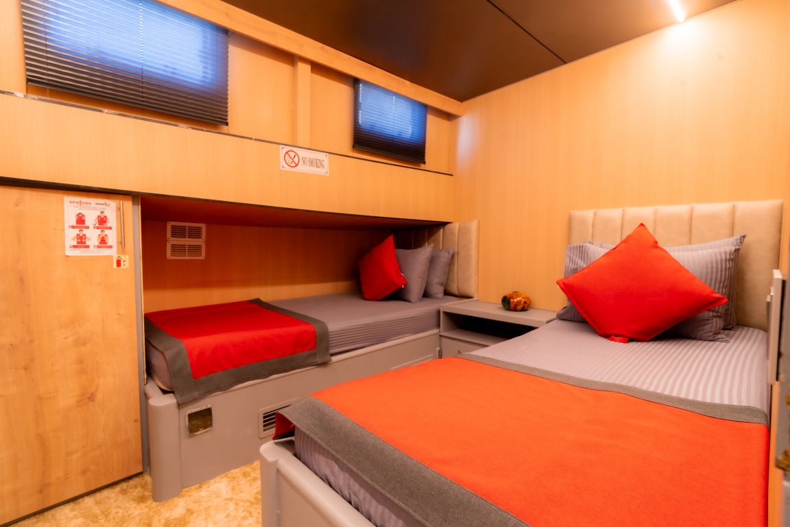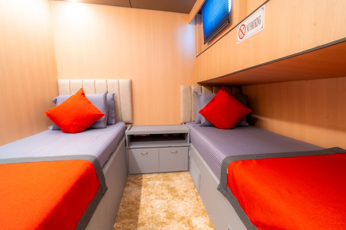 | Jusqu'à 10 personnes; 2 cabines Master, 1 cabine double, 2 cabines à lits jumeaux (convertibles en lit double). Climatisation, douche et toilettes de type domestique dans toutes les cabines. Cabines équipage séparées. |