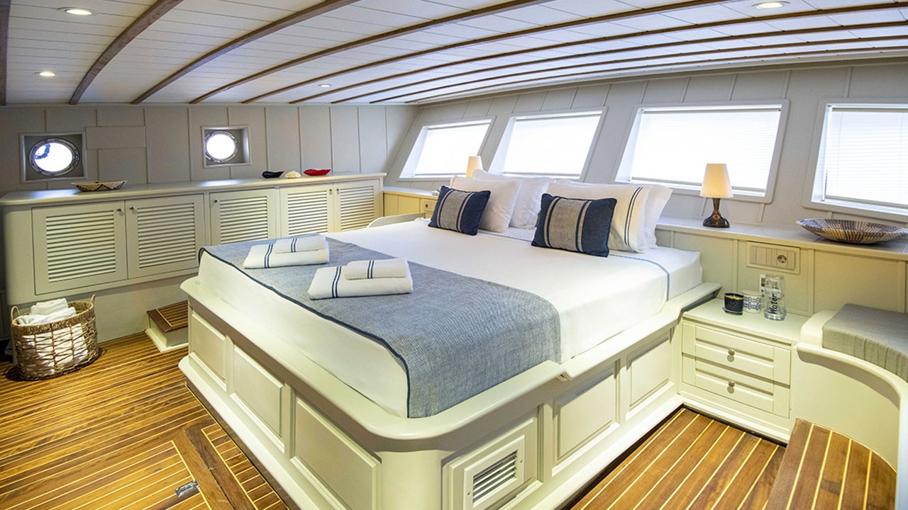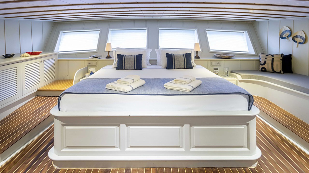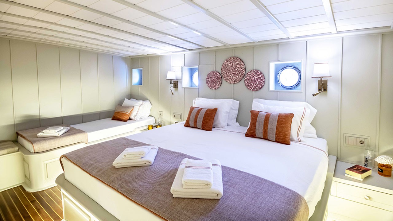 | Jusqu'à 12 personnes ; 2 cabines principales, 1 double, 2 cabines triples, cabine de douche et toilettes dans toutes les cabines, cabines d'équipage séparées. |