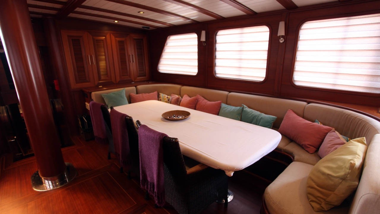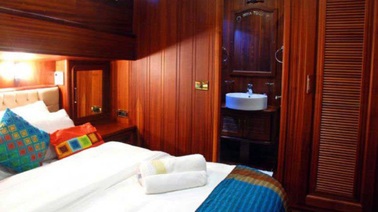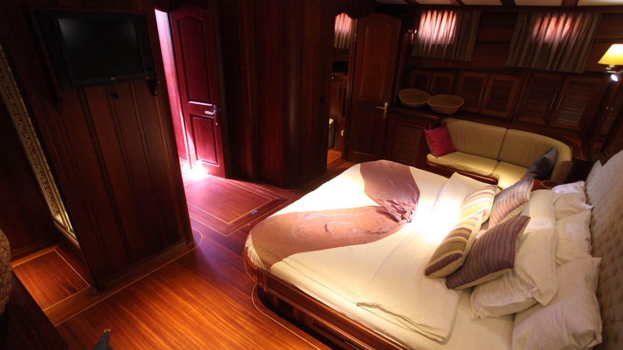 | 6 cabines comprenant : 2 cabines principales avec lit double queen-size, 2 cabines doubles et 2 cabines avec lits jumeaux. Capacité maximale : 12 personnes. Toutes les cabines disposent d'une salle de bain privative avec douche à jets puissants, d'une climatisation individuelle à télécommande et de toilettes à chasse d'eau. Cabines d'équipage séparées. |