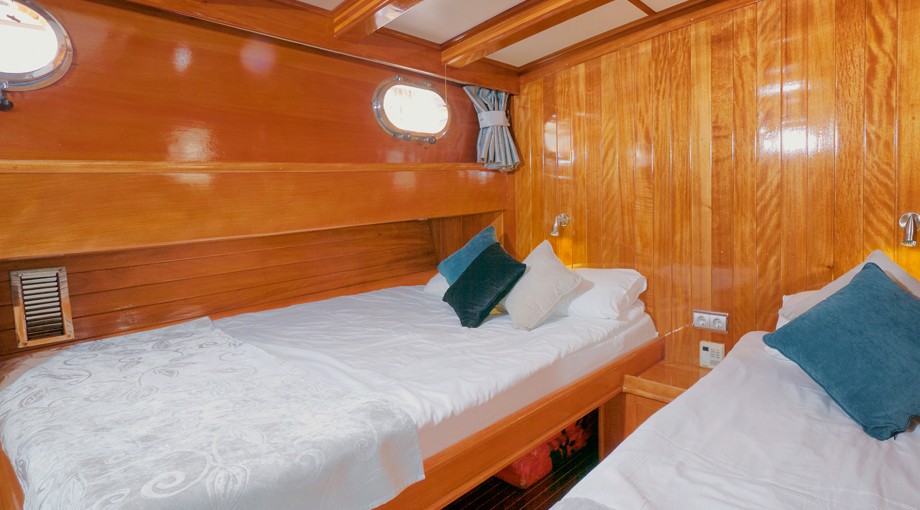 | Jusqu'à 17 personnes ; 2 cabines principales, 3 doubles, 1 triple, 2 cabines twin, climatisation, lecteur TV/DVD/CD, cabine de douche et toilettes de type maison dans toutes les cabines, cabines d'équipage séparées. |
