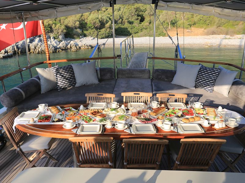 Poulet à la sauce béchamel, purée de pommes de terre, entrées, salade, kebab aux champignons, riz, haricots à l'huile d'olive, entrées, salade, poisson, salade d'aubergines, courgettes à l'huile d'olive, haydari, salade américaine, boulettes de viande, pâtes au four, yaourt, pourpier, friture, entrées, salade, assiette mixte de viandes grillées et de poulet, riz, variétés d'entrées, salade, poulet au four, börek, kebab forestier, riz, entrées et variétés de salades (fruits ou dessert après chaque repas).