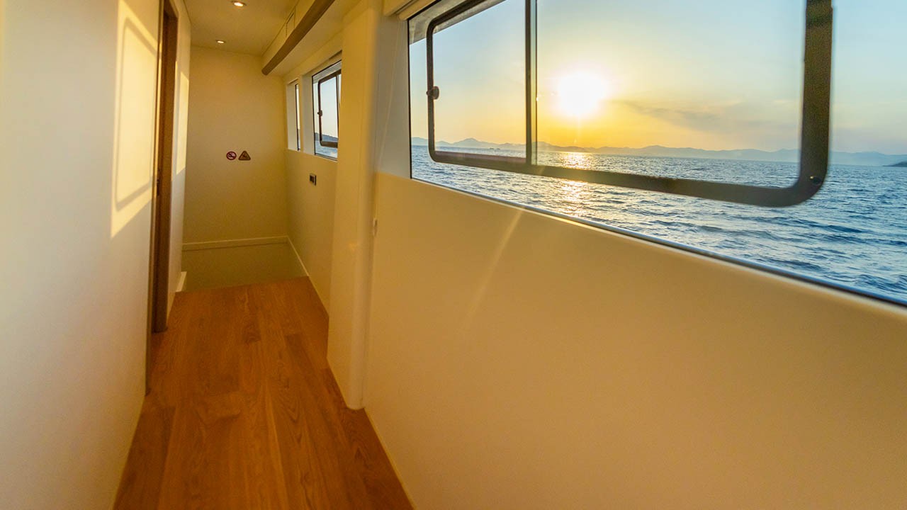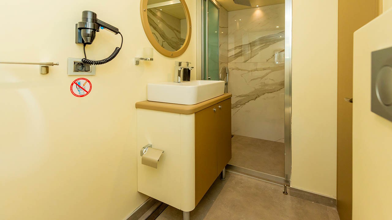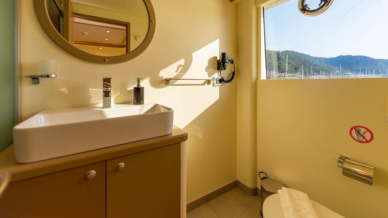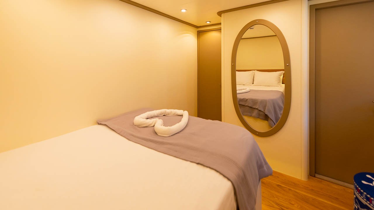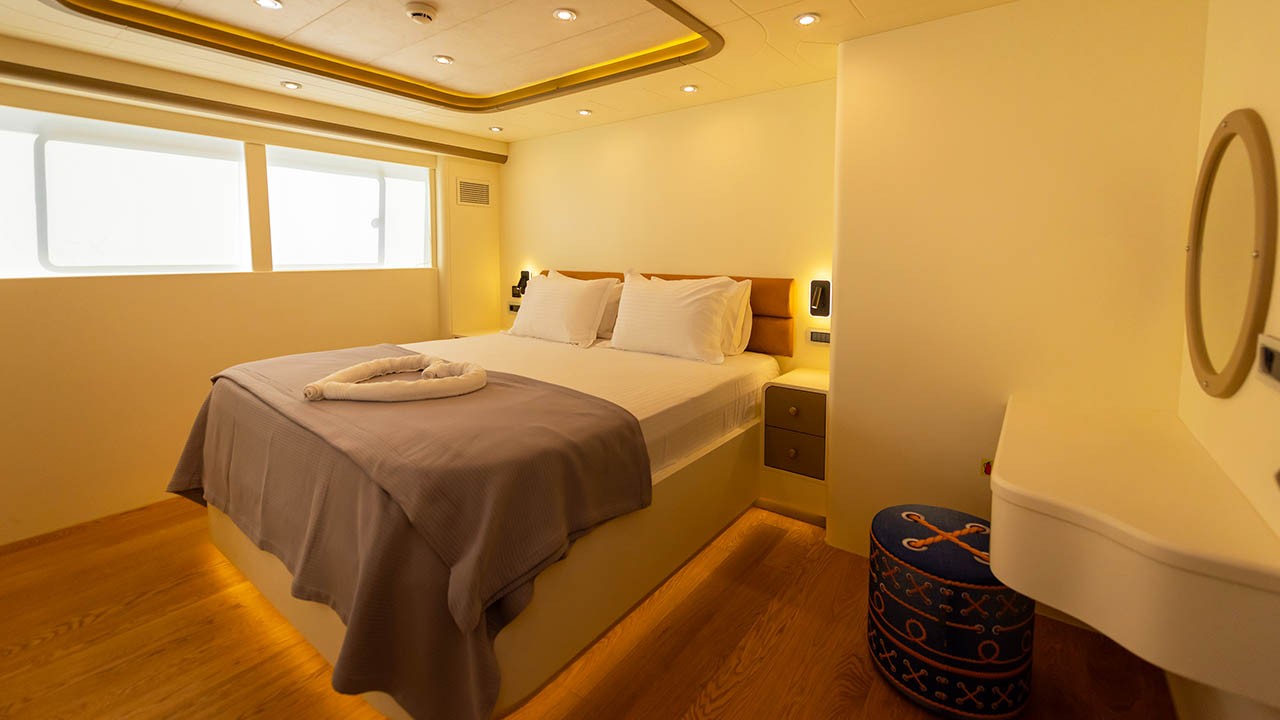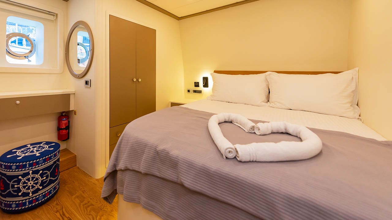 6 cabines comprenant : 2 cabines principales avec lit double, 4 cabines doubles. Toutes les cabines sont équipées d’une salle de bain privative, de la climatisation individuelle à télécommande, de la télévision par satellite, d’un système audio, de toilettes à chasse d’eau, d’un sèche-cheveux et d’extincteurs. |