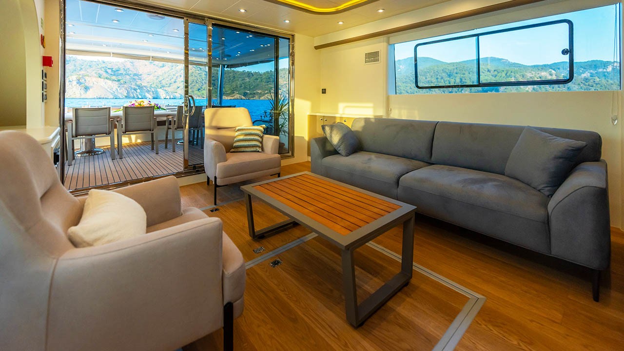 Équipement de navigation complet : radar, GPS, sondeur, Navtex, pilote automatique, VHF, téléphone GSM, dessalinisateur. Loisirs : ski nautique, planche à voile, canoë, bouée tractée, wakeboard, paddle, matériel de plongée avec tuba et de pêche, TV LCD, Wi-Fi. |